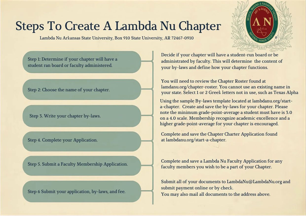 All accredited radiologic and imaging sciences programs are eligible for charters to establish their own chapters to recognize and honor those students exhibiting exemplary scholastic ability as students in the profession. There is a one-time charter fee ($150), after which the national organization provides a wide range of services to help start and maintain honors programs in all the radiologic and imaging sciences in all schools (hospital medical centers, community colleges, and universities). Services range from recognition paraphernalia for graduation (pins, certificates, honors cords, gown stoles, cap tassels) to national scholarship recognition and awards as well as grants for advanced study and research. A single chapter may induct students from all programs conducted by the institution chartering the chapter.